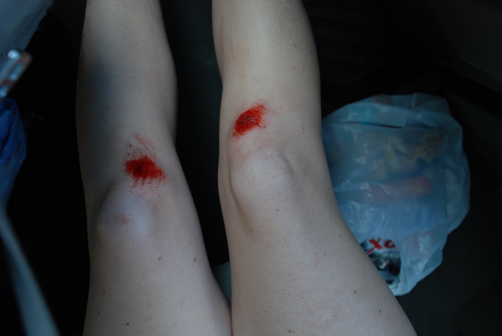 And here are my knees after my first leg. That sucked. I figured out I ran about 10 miles total with my knees like this. Needless to say, I have not run since then... hopefully soon but so far no thank you.